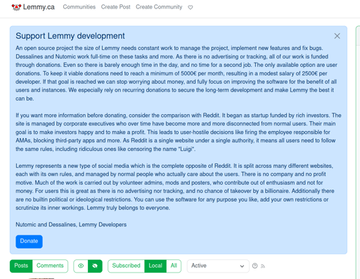 Anyone else getting these donation ads? Was it just shoved onto an update by the Lemmy devs, or is this coming from the instance admins? It doesn’t seem to show on clean browser sessions to lemmy.ca