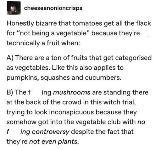 But if we are having fun with this, rhubarb: definitely no fruit, but far too sweet, too often consumed raw or minimally processed, and far too at home in a yoghurt to fit nicely into the group vegetable.