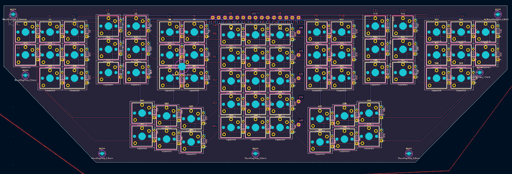 I know there’s no microcontroller. I’m planning to hand wire in a Raspberry Pi Pico that’ll sit in the case so i don’t have to make room for it on the PCB. That’s what the connections at the top of the board and right of the middle pad are for. They’re wired into the matrix already. The seven mounting holes around the edges are just screw holes, and the one on the left hand between some keys is for the stem of a trackpoint that’ll also be hand wired under the PCB. The switches here are Choc V1, not MX.