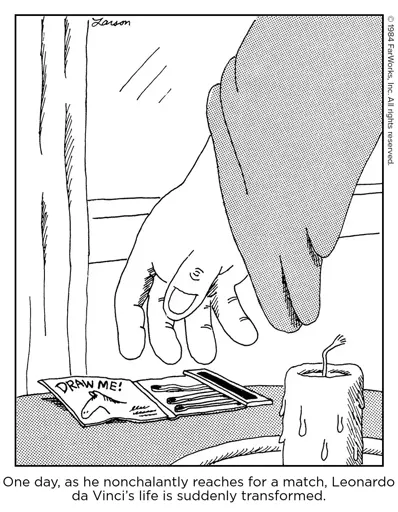 These match books have card matches so they are difficult to strike like a wooden match. The card match is drawn through between the cover of the matchbook and the striking surface. So the ad on the front of the packet is a word play on the igniting mechanism. Larson’s joke here seems to be that Michaelangelo Da Vinci , one of history’s most famous artists, was inspired to become an artist by one of these everyday matchbook puns.