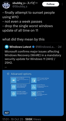 Microsoft are providing support and security updates for enterprise customers for another ten years (because loads of shit that makes companies, institutions, government networks etc run on outdated OS’s) but don’t give a shit about individual users so are forcing them to upgrade to their AI-infected Windows 11.