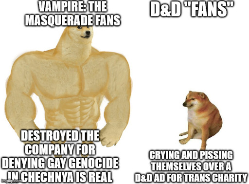 So this is inspired by chuds getting their panties in a twist over a piece of art posted on D&D official twitter account for trans charity. As I sit deeply in World of Darkness currently, I thought how much more based V:tM fandom was even when they get mad - like that time one of V:tM books said very real genocide of gay people in Chechnya is a lie to cover Vampire operations, and V:tM fans got so mad at such blatant homophobia, the company publishing WoD, White Wolf, got dissolved and absorbed by its parent company, Paradox Interactive, only being restored this year with new people incharge. THAT’S how you do fan outrage.
