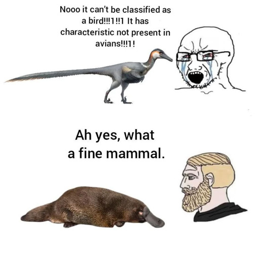 Aww, poor soyjak, are you upset nature doesn’t adhere to your imaginary grouping made up before you had as much knowledge?