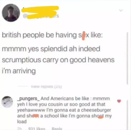 It’s also a disproportionate response. “British people talk funny” gets “American school children are regularly shot at school, lol tragedy”.