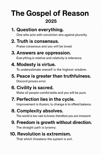 Question everything is especially poorly chosen as it echoes Marx’s “ruthless criticism of everything”, while not really matching the rule’s actual definition that is more about never acting with conviction. I would change it to “Never commit to anything”