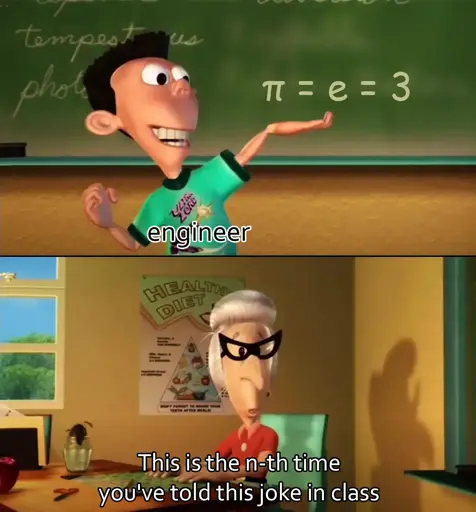 It’s not even a good joke because any engineer who was dumb enough to round pi to 3 would quickly find themselves out of a job. No engineer does this. They either use a pi function, or 3.14