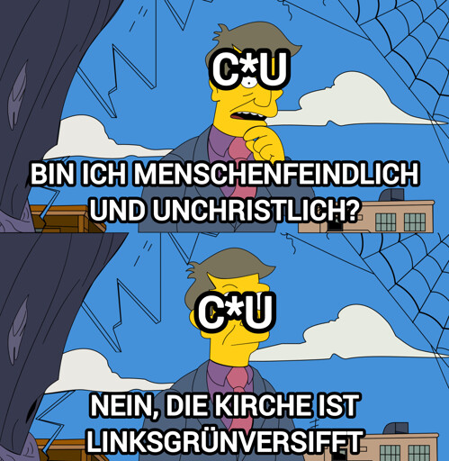 (Die Kirche ist jetzt natürlich selber kein Leuchtfeuer der Menschlichkeit und des Fortschritts. Die Union is nur noch kaputter.)