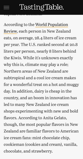 each person in New Zealand eats, on average, 28.4 liters of ice cream per year. The U.S. ranked second at 20.8 liters per person,