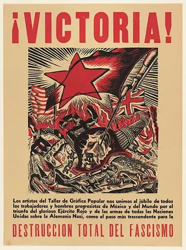 After almost five years of brutal conflict, World War II came to an end with Germany surrendering on May 8, 1945, followed by Japan on September 2 after the atomic bombings of Hiroshima and Nagasaki. This poster celebrates the victory of the Allies and the Soviet Red Army and the “total destruction of fascism.” Triumph is expressed through striking imagery: a bayonet stuck in Hitler’s eye socket, chaotic surrounding debris, and rays of light in the background that suggest a new dawn. The text describes the jubilation of the artists at the TGP, the workers, and all those who fought for progress in Mexico.