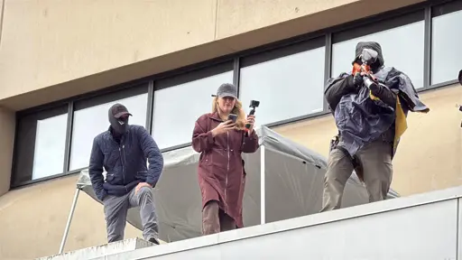 Right-wing podcaster Brandi Kruse filming ICE agents shooting pepper balls at peaceful protesters from the rooftop of the ICE facility