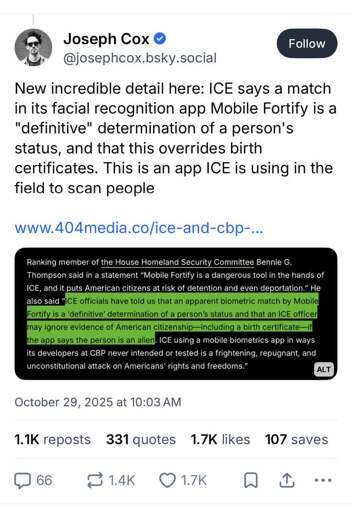 Fucking excuse me? An app is supposed to override my goddamn birth certificate? Absolutely not. In fact, I’ll be damned if I let a cop scan my face without putting up a fight. I’m walking away unless detained, and if I’m detained, I’m not doing a fucking thing until I have my lawyer.