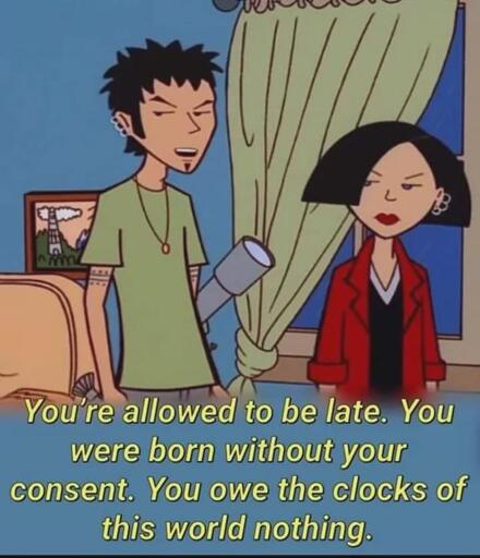 Helped me to realize that even I’m not showing up on time out of a respect for other people, I just fear consequences. Ironically it really is dictatorship of the clocks for me.