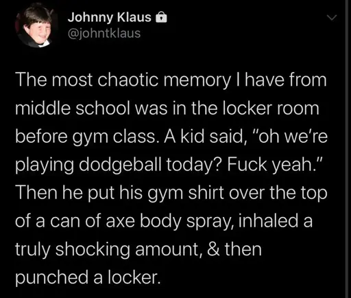 You build a little tent with your gym shirt, spray it full of delicious Axe body spray aerosol so it’s nicely contained in said little fabric tent. Continue by poking your head into the tent and inhale deeply.