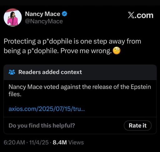 XCancel doesn’t show notes. But you can enjoy the replies. https://xcancel.com/NancyMace/status/1985683445427962100#m