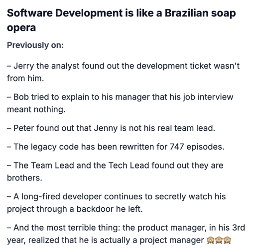 arrow-up176imageSoftware Development is like a Brazilian soap operalemmy.ml☆ Yσɠƚԋσʂ ☆@lemmy.ml to Programmer Humor@lemmy.mlEnglish · 26 days agomessage-square4fedilinkcross-posted to: funny@sh.itjust.works