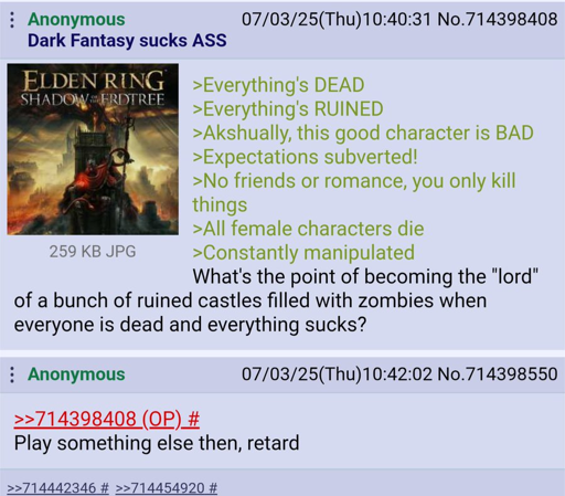 Valid but personally I’m way more sick of the gameplay style than the dark fantasy theme. It was fun for Demon’s Souls, Dark Souls, and Dark Souls 2, but after that I just can’t stomach another game based on melee combat with dodge rolling and reacting to telegraphed enemy attack patterns.