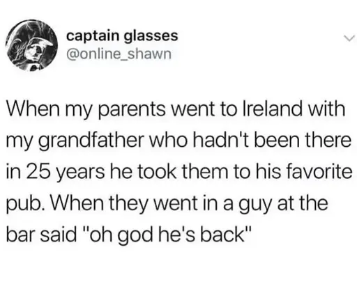 The trick to this kind of anecdote is that they could have been there for two hours, explained that the grandfather had lived there before, and eventually someone said “oh, so he’s back?” and everyone laughed.