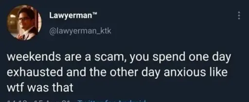 I work 9-5 weekdays and 8P-3A Sa - Th, so my real weekend is Friday because I can sleep in Saturday morning.