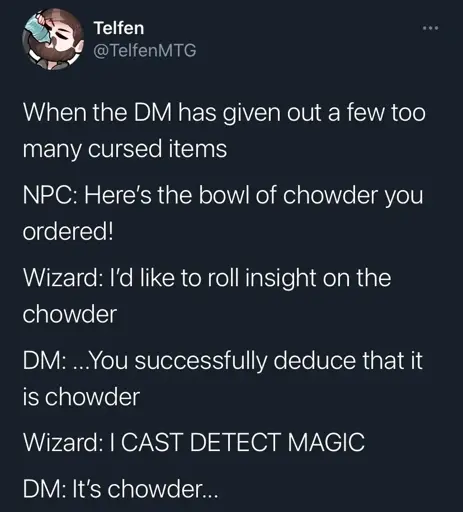 DM: “The spoon is a mimic. It latches onto your face and causes 35 points of damage.”