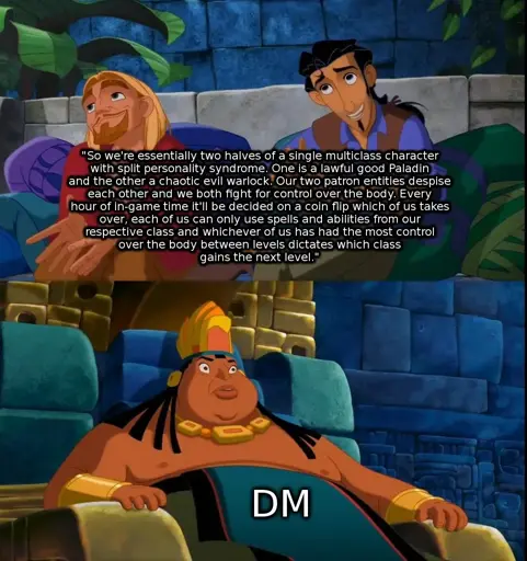 Mechanically speaking, the evil one surfaces in high stress situations (And even then, I have to fail a con save for it to take effect) and I automatically revert to the good one upon falling asleep or otherwise losing consciousness in some way. I ran all of this by my dm to make sure it wouldn’t screw over the party too much or be too powerful. It was my favorite character thus far.