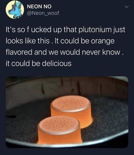This could be a cool song title: ‘And the post said plutonium pucks, could taste like orange crush’.