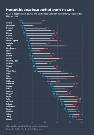 I’d be curious to see the changes. Nigeria got worse, but did the rest of the countries? Even this one has a lot where the majority are still homophobic, despite the decline.