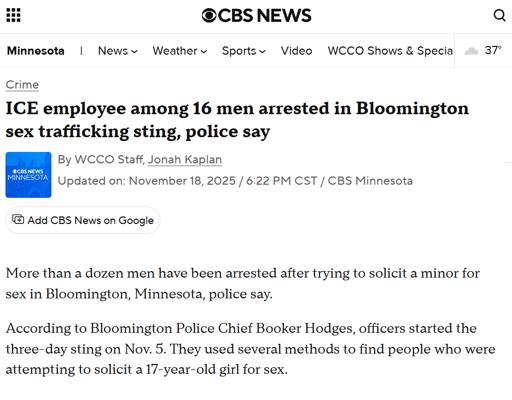 More than a dozen men have been arrested after trying to solicit a minor for sex in Bloomington, Minnesota, police say. According to Bloomington Police Chief Booker Hodges, officers started the three-day sting on Nov. 5. They used several methods to find people who were attempting to solicit a 17-year-old girl for sex. In all, police arrested 16 men during the investigation, which Hodges called “Operation Creep.” Hodges said most of the men came from within the Twin Cities area. One of the men, he said, is an employee for Immigration and Customs Enforcement, who could face federal charges. Hodges said the ICE employee works as an auditor.