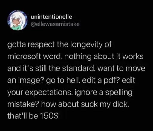 minus-squarechiliedogg@lemmy.worldlinkfedilinkarrow-up6·3 days agoI’m a Microsoft user. I don’t want solutions - I want to bitch about stuff.