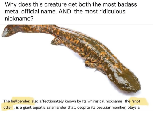 minus-squaredumbass@piefed.sociallinkfedilinkEnglisharrow-up31·8 days agoSnot otter is a pretty accurate name for that thing.