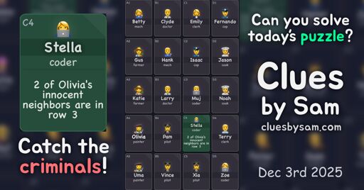 I solved the daily Clues by Sam, Dec 3rd 2025 (Tricky), in 02:52 🟩🟩🟩🟩 🟩🟩🟩🟩 🟩🟩🟩🟩 🟩🟩🟩🟩 🟩🟩🟩🟩 https://cluesbysam.com/