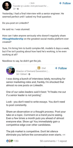 Although the first post is satire, I’ve had people non-ironically say similar to me about how important posting on LinkedIn is.