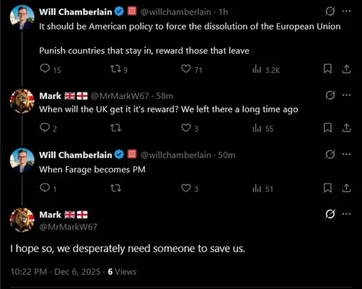 The continued existence of a free and democratic Europe could remind US citizens of what they once had and how much better they could be living, which makes the continued existence and success (fingers crossed) of the EU an existential threat to US conservatives.Or maybe Putin + Xi consider the battle for the spite and minds of US Americans won and so they’re now moving the focus of their troll armies + proxies to the EU. If all trolls suddenly get the same new talking points, that’s not organic, that’s a strategic shift mandated from the top.