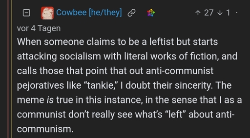 The belief that “tankie” is an anti-communist pejorative is really all you need to know about his politics. Imagine using Western nations as the lens to constantly talk shit about imperialism, while dry humping the legs of other imperialist nations. And they’ll use as much pseudo-intellectualist, cherry-picked logic as they need to defend their hypocritical arguments, while dismissing any arguments to the contrary as CIA-backed propaganda, despite overwhelming evidence from multiple sources. Marx is rolling in his grave.