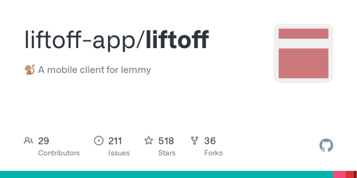 Generator@lemmy.pt to Linux@sopuli.xyz · 2 years agoLiftoff! - 🐒 A mobile client for Lemmy (Android/iOS/Windows/Linux)github.comexternal-linkmessage-square1fedilinkarrow-up130cross-posted to: general@lemmy.worldandroidapps@lemmy.worldflutter@programming.devtech@pawb.socialapple_enthusiast@lemmy.worldmobile@lemmy.worldlinux@lemmy.mlfossdroid@social.fossware.space