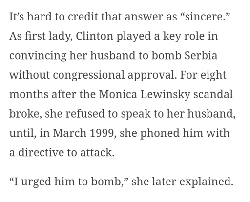Hillary_Clinton [none/use name]@hexbear.net to Main, home of the dope ass bear.@hexbear.netEnglish · 5 years ago"Honey, I will forgive you for cheating on me if you bomb Serbia". XOXO.plus-squarehexbear.netimagemessage-square2fedilinkarrow-up10