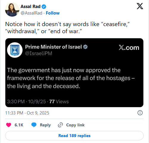 Like I said, Palestinians were not consulted on Trump’s “peace plan”. The plan entails total Palestinian surrender. Qatar and Egypt sent it to Hamas yesterday. Scahill detailed the conditions Hamas are in after the assassination attempt in Doha. Kept in isolation from each other, minimal use of any devices. How are they going to respond within 4 days is anybody’s guess
